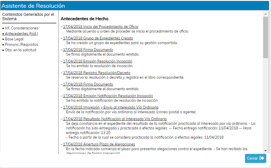 Con toda esta información recogida a lo largo de un procedimiento, el sistema puede emitir informes o resoluciones de forma totalmente automatizada, facilitando con ello la labor del usuario y sobre todo aumentando su productividad.
