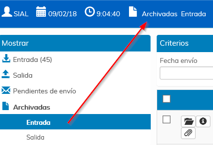 Archivadas. Muestra las comunicaciones de entrada y de salida que hemos archivado con el botón correspondiente. También podemos seleccionar solo las archivas de entrada o las archivas de salida.