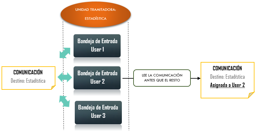 Por ejemplo, una comunicación es enviada a la unidad tramitadora Estadística, y esa unidad tramitadora tiene 3 usuarios definidos (User1, User2 y User3). La comunicación llega a las bandejas de entrada de los 3 usuarios y es el User2 quien la lee primero, lo que provoca que la comunicación se asigne al User2.