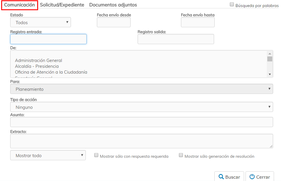 Comunicación. En esta pestaña podemos buscar comunicaciones, por ejemplo, por origen o destinatario, por el asunto de la comunicación, comunicaciones de traslado o comunicaciones con respuesta requerida.