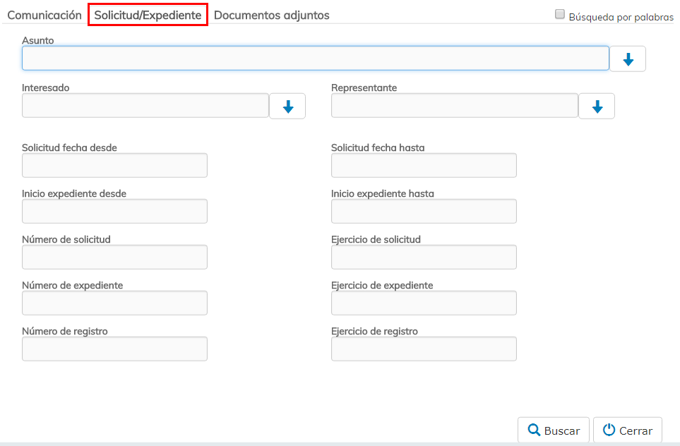 Mediante esta pestaña podemos localizar una comunicación asociada a expediente, mediante los criterios que encontramos en ella.