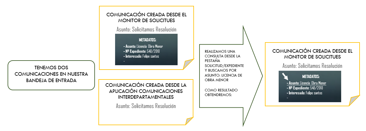 Solicitud/Expediente. Es importante aclarar que algunas comunicaciones pueden "nacer" de un expediente, es decir, has sido enviadas, originalmente, desde el monitor de solicitudes. En caso de que sea así, esa comunicación quedará asociada a ese expediente, así como todos sus datos; asunto, número de expediente, interesado, etc., aunque nosotros no lo podamos ver explícitamente en la propia comunicación.