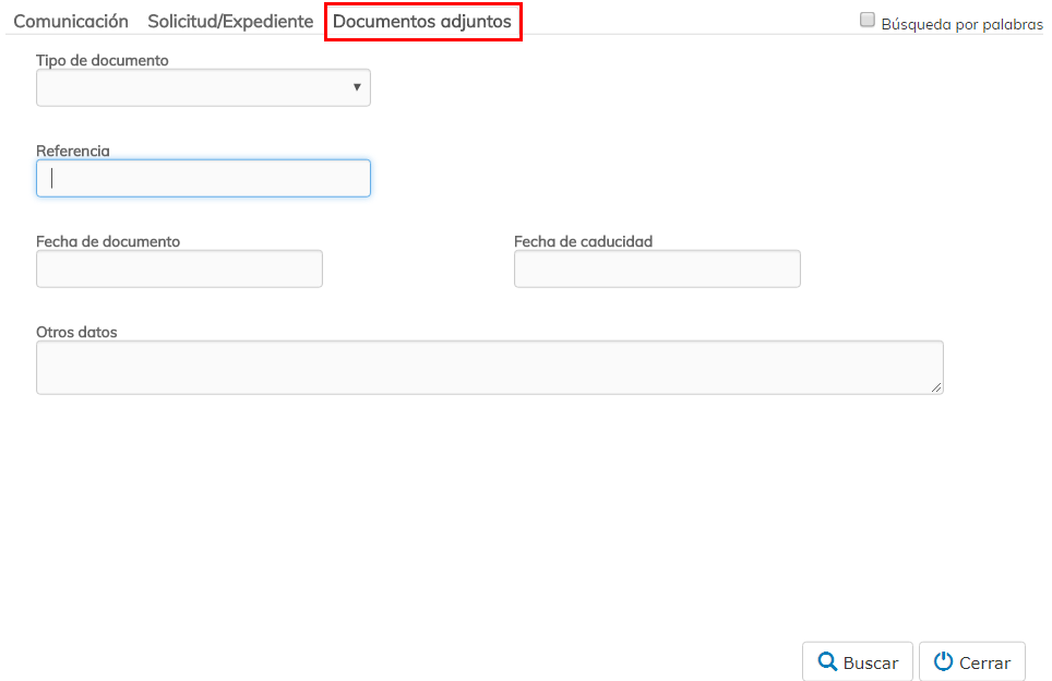 Documentos adjuntos. Otra forma de localizar una comunicación es mediante los documentos que lleva adjuntos. En esta pestaña encontramos diferentes campos para localizar un documento adjunto a una comunicación.