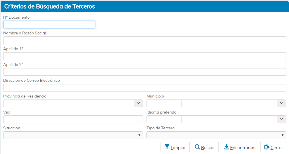 Al pulsar en el icono indicado, se abrirá la ventana de Criterios de Búsqueda de Terceros.