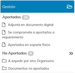 Vista Gestión. En esta vista los documentos se agruparán por la forma de aportación de los mismos. Esta es la vista que tendremos habilitada por defecto y los documentos se clasificarán automáticamente, sin posibilidad de modificación por parte del usuario.