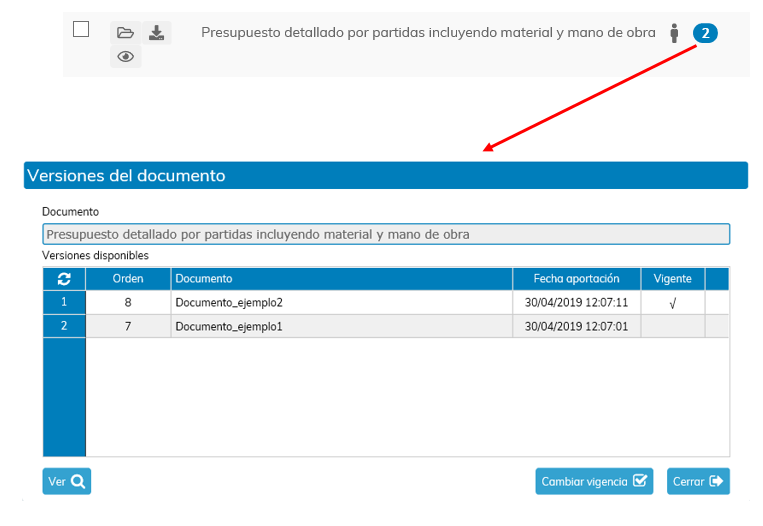 En esta ventana podemos visualizar cada versión del documento, así como, indicar qué versión está vigente en este momento.