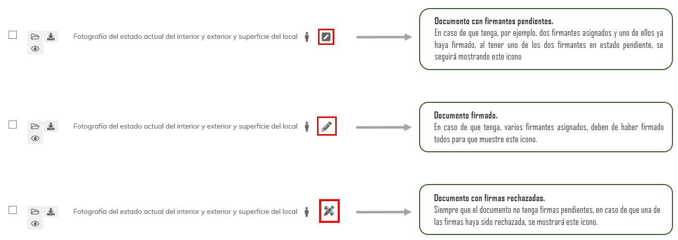 En caso de que algún documento de la rejilla tenga firmantes asignados, aparecerá un icono junto con la descripción del documento.