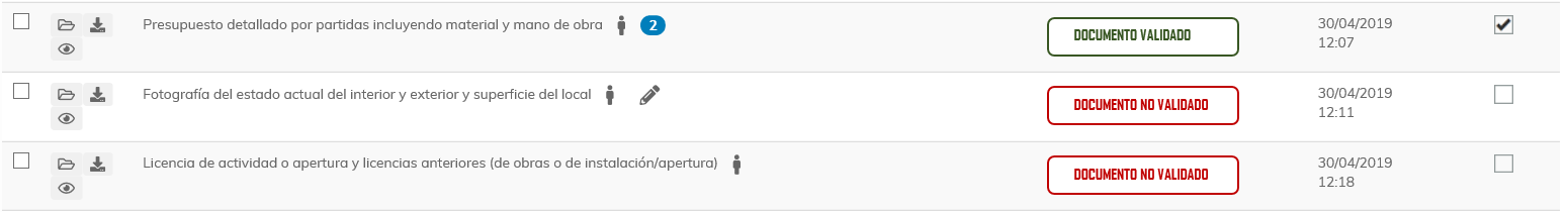 Para cambiar la validación, seleccionaremos uno o varios documentos, y pulsaremos en este icono.