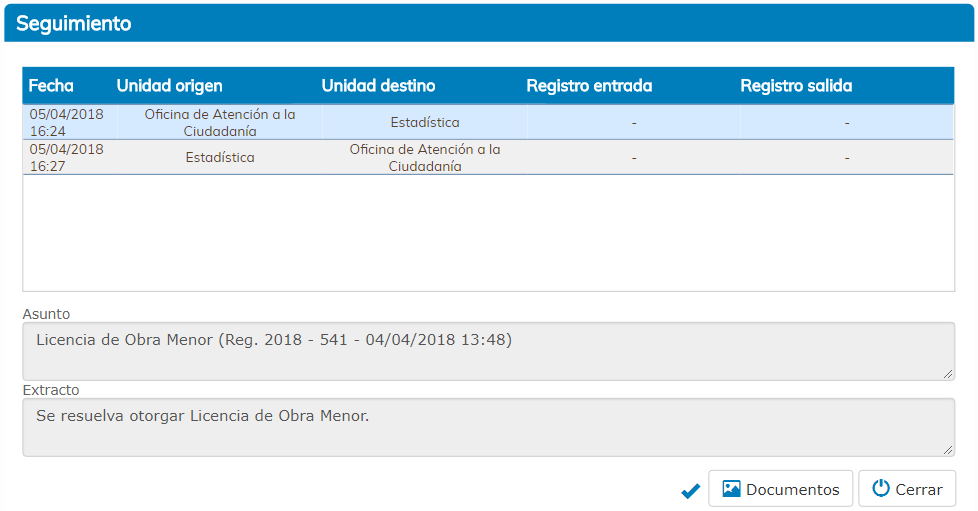 Cada fila de la rejilla superior corresponde a una comunicación interdepartamental. Si seleccionamos una, podemos visualizar el asunto y el extracto, así como la documentación que tiene adjunta.