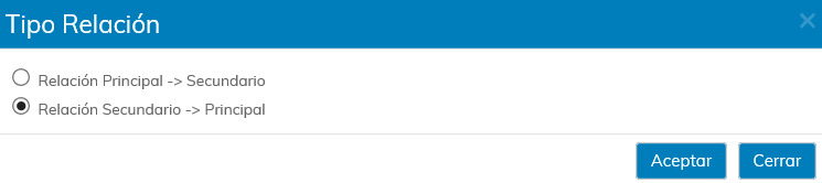 Por otro lado, si seleccionamos varios expedientes de la rejilla, el tipo de relación por defecto será, Relación Secundario -> Principal.