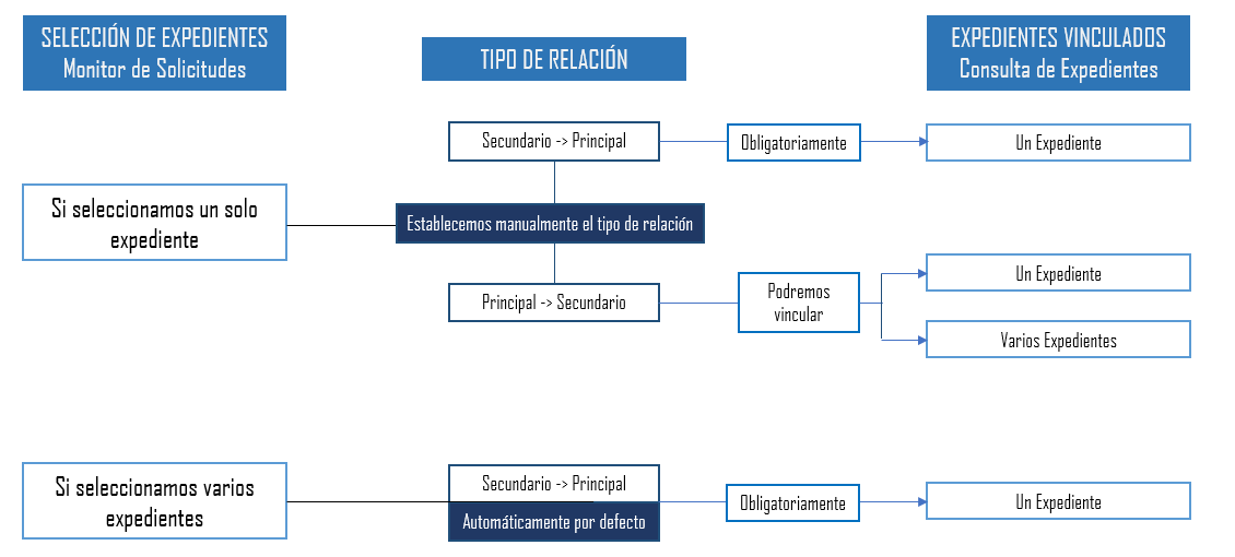 Relación Principal -> Secundario. El expediente seleccionado actuará como expediente principal del expediente o expedientes que seleccionemos posteriormente.