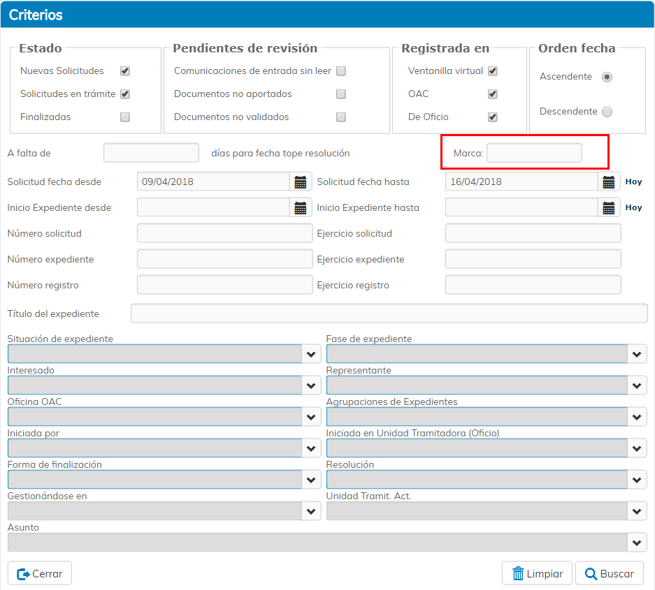 Siempre que seleccionemos una solicitud para la que no se haya iniciado expediente, podremos cambiar el asunto de la misma.