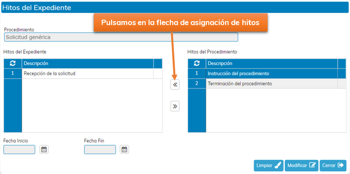 Podemos desasignar un hito del expediente y devolverlo a la rejilla de hitos del procedimiento.