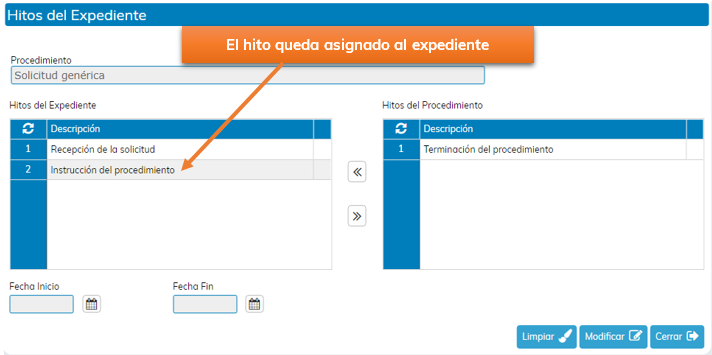 Si seleccionamos un hito de la rejilla de hitos del procedimiento podemos asignarlo al expediente pulsando en este icono.
