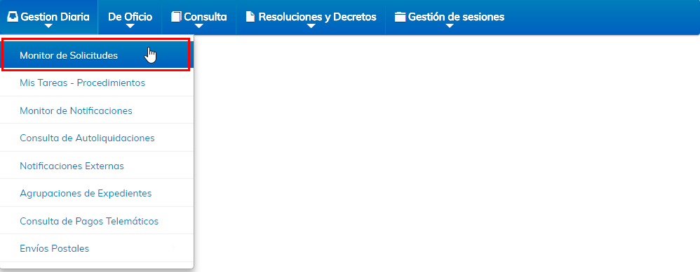 Una vez accedido al módulo de Tramitación, desplegamos la pestaña Gestión Diaria, y seleccionamos la opción Monitor de Solicitudes.