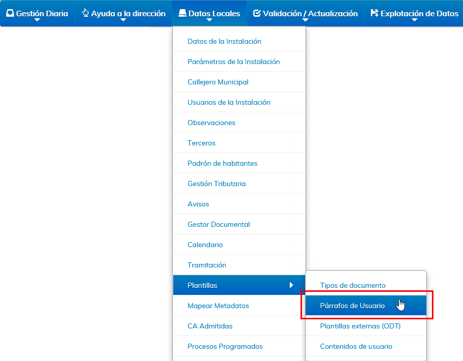 El Mantenimiento de Párrafos de Usuario se encuentra ubicado en la BDI de nuestra instalación, Datos Locales, Plantillas, Párrafos de Usuario.
