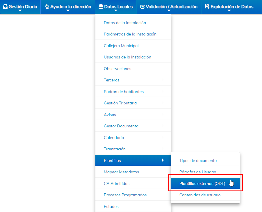 El Mantenimiento de Plantillas Externas (ODT) es donde vamos a poder dar de alta o configurar plantillas, que podremos usar en la generación de documentos desde el Monitor de Solicitudes o desde el Gestor de Tareas.