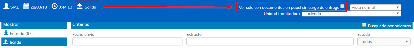 Para generar la minuta tenemos que situarnos en la bandeja de salida y activar el check "Ver sólo con documentos en papel sin cargo de entrega".