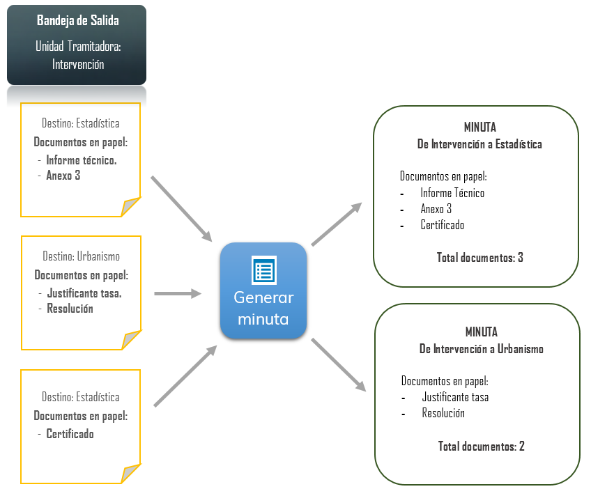 En caso de generar minuta para varias comunicaciones seleccionadas, los documentos en papel se agruparán en minutas por unidad tramitadora de destino.