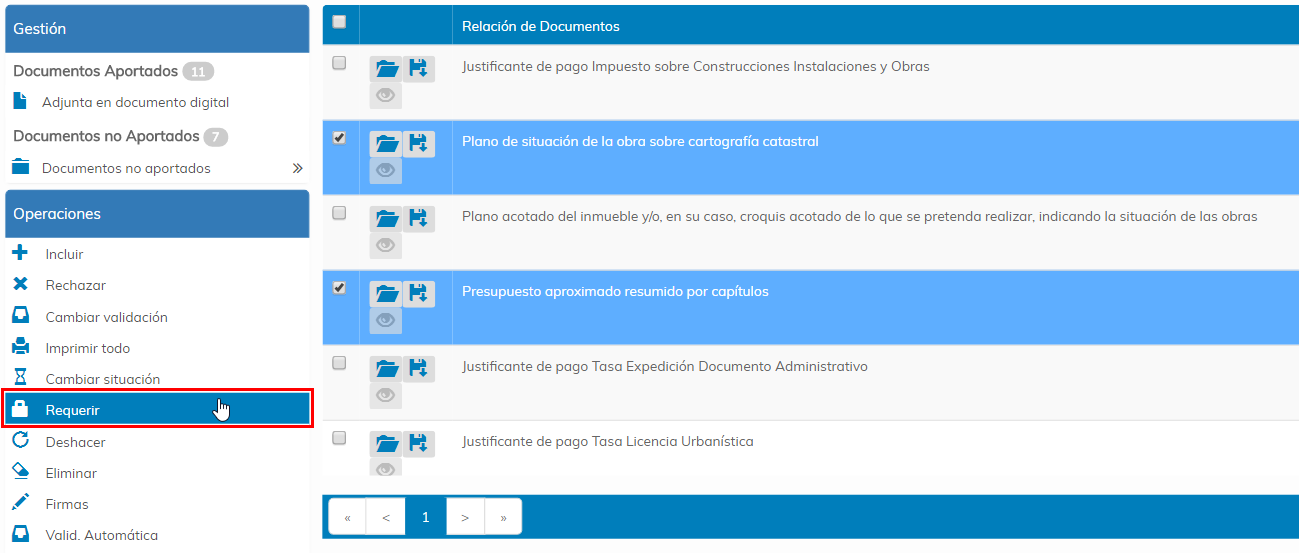 Para requerir uno o varios documentos, debemos de seleccionarlos de la bandeja de documentos no aportados. Una vez realizada la selección, pulsamos en el icono Requerir.