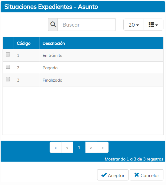 Con esta icono, desplegamos las distintas situaciones en que se puede encontrar la solicitud que hemos seleccionado previamente.